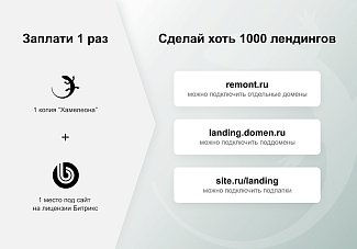 - Возможность создавать неограниченное количество лендингов на одном решении ХАМЕЛЕОН и одной лицензии Битрикса. Можно даже не занимать «место под сайт» на лицензии Битрикса